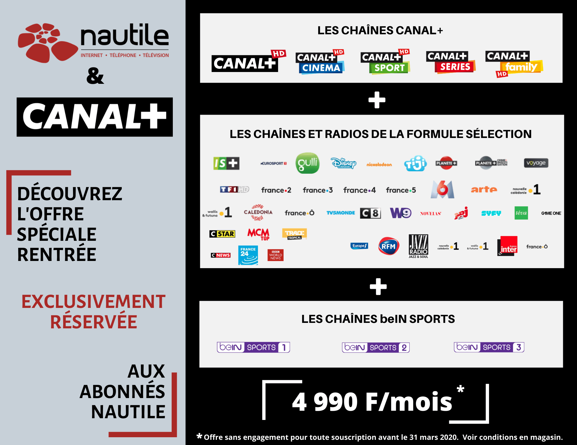 En partenariat avec CANAL+ et jusqu’au 31 mars 2020, Nautile vous propose une offre exclusive, sans engagement de durée à seulement 4 990 F par mois !