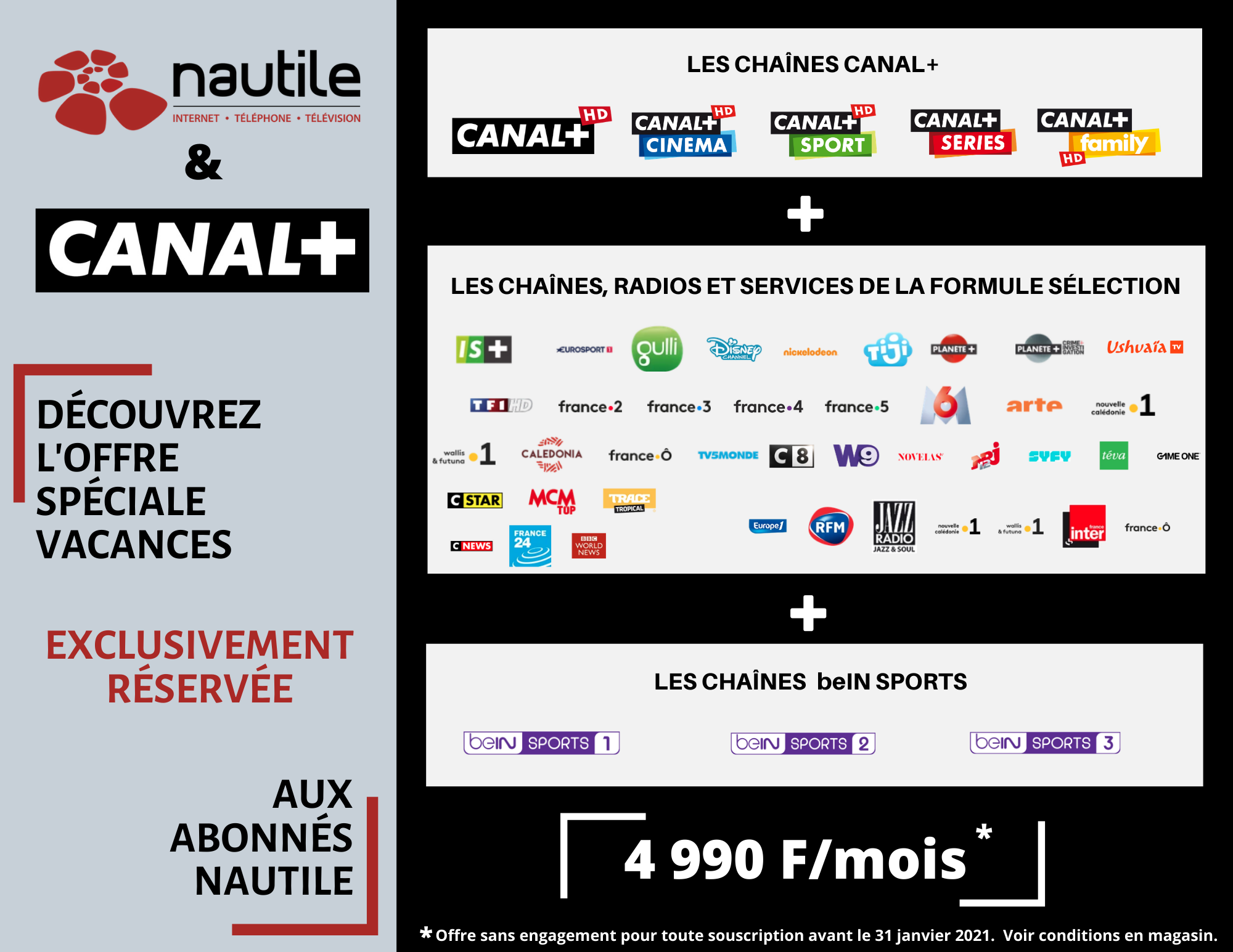 En partenariat avec CANAL+ et jusqu’au 31 janvier 2021, Nautile vous propose une offre exclusive, sans engagement de durée à seulement 4 990 F par mois !